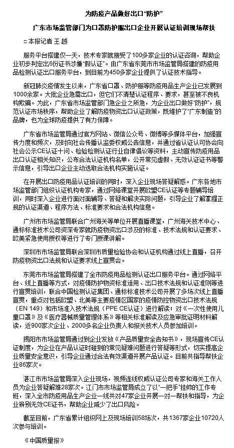 根據《中國質量報》2020年4月29日的報道:“為防疫產品做好出口“防護”廣東市場監管部門為口罩防護服出口企業開展認證培訓現場幫扶”,4月初開始廣東省政府及廣東各質量監督部門,市場監督部門,共同搭建認證服務平臺,輔助企業做好認證技術指導。由廣東省東莞市市場監管局搭建的防疫用品檢測認證出口服務平臺,為450多家企業提供了認證技術指導。