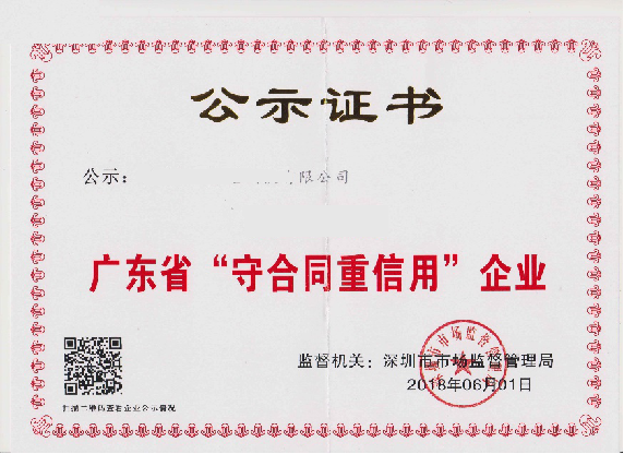 《廣東省守合同重信用企業》由政府機構頒發,在廣東省內注冊經營兩年以上,從未出現違規經營、合同詐騙、制假售假等不良現象,合同管理制度健全,能全面、實際地履行合同,除不可抗力、對方違約或雙方協議解除等法律規定的情形外,合同履約率達100%,經工商部門認定并向外界公示信譽口碑極好的企業。